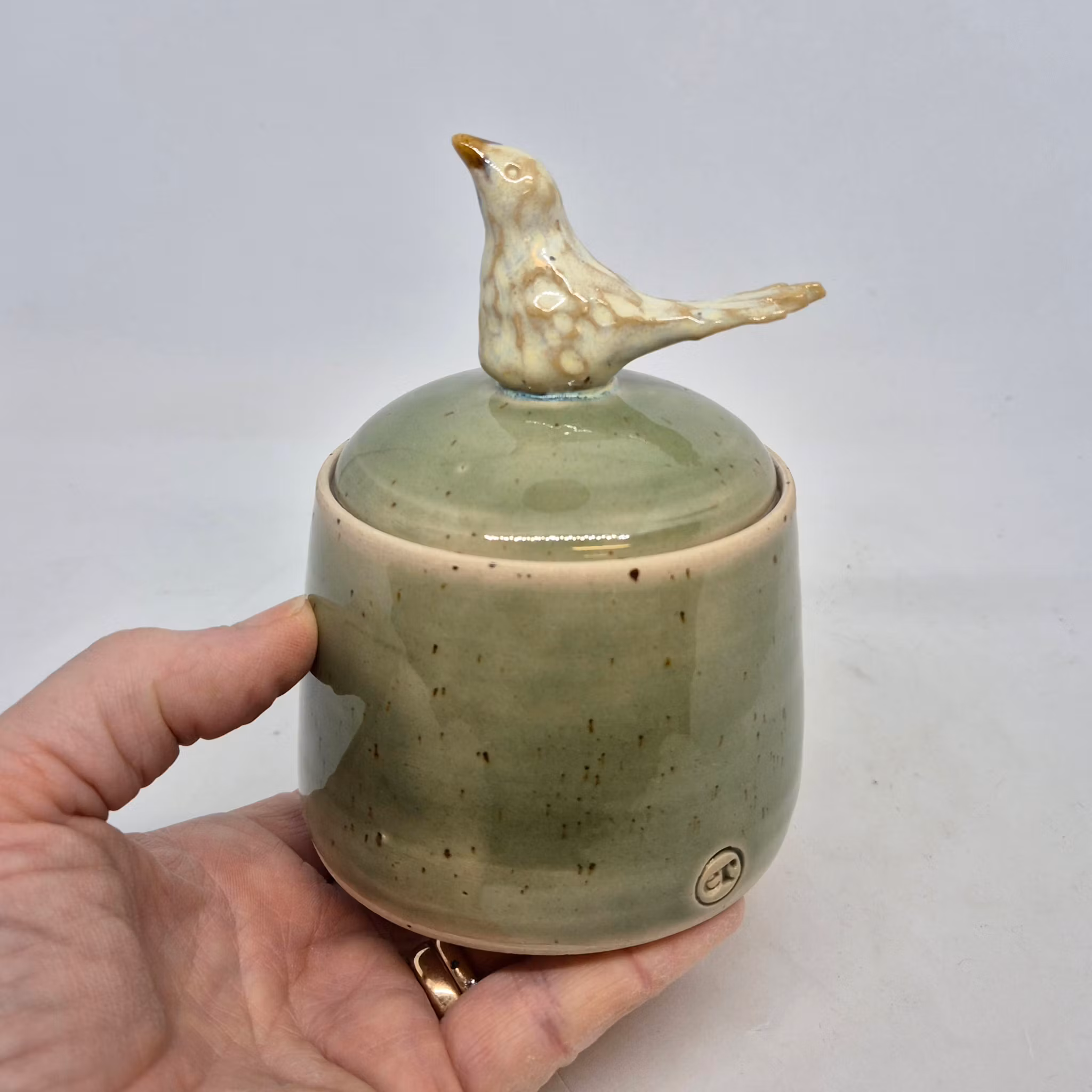 Skål med lock "fågel" 560 kr Skål med lock och fågelknopp. Produkten är tyvärr slut i lager. :( Artikelnummer: 181 Dela Information Recensioner Skål med lock och fågelknopp.Glaserad i en ljus celadongrön högblank glasyr.Insidan är matt vit.Endast ett exemplar.Höjd ca 13 cmBredd ca 9 cm